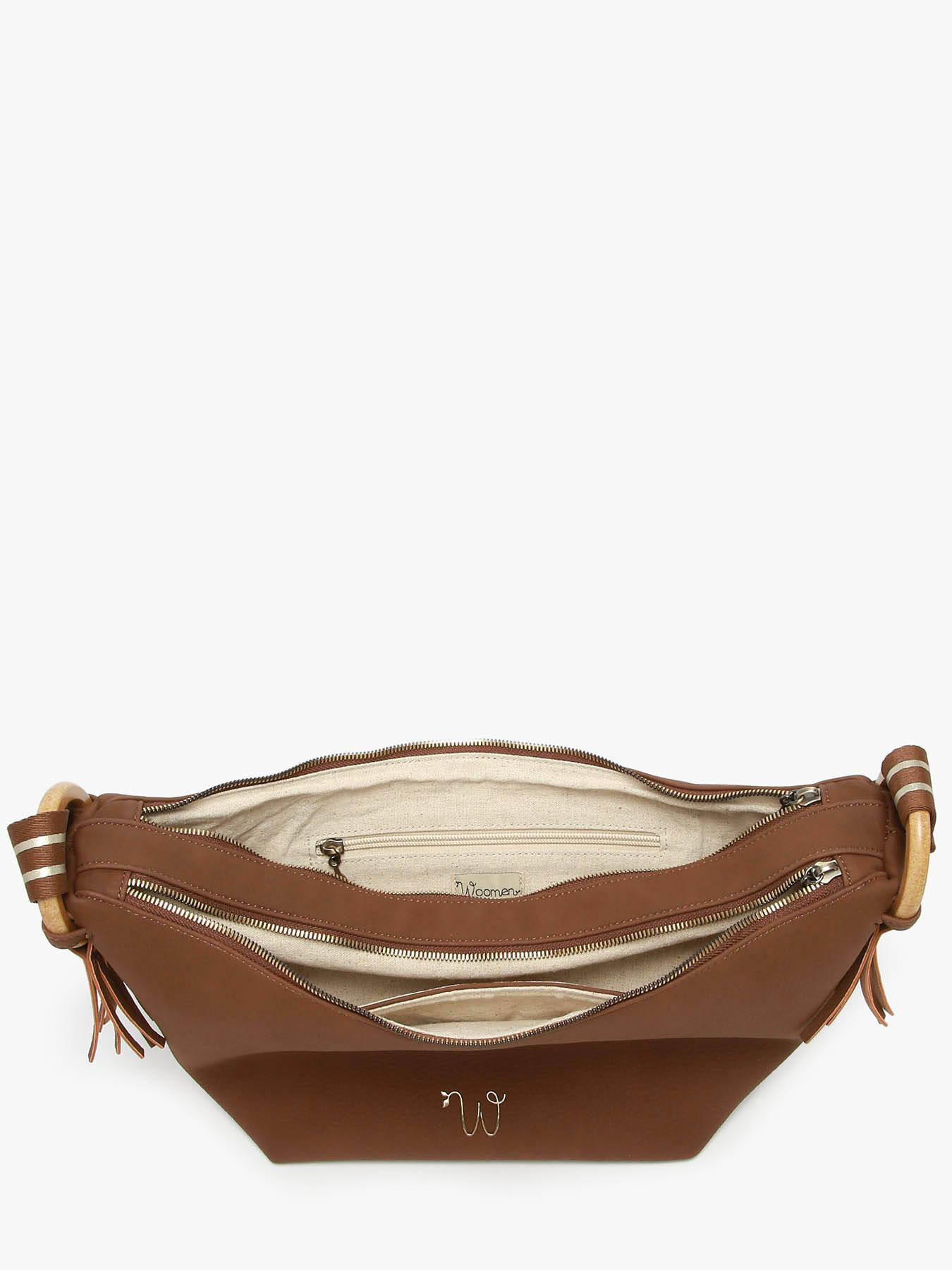 Deze cross body tas van WOOMEN uit de CAMOMILLE-lijn valt op door de elegante franjes aan de zijkanten bij de ringen en de verstelbare schouderriem met een iriserende bies. Gemaakt van gerecycled polyurethaan met een voering van katoen en linnen, heeft hij een handige dubbele opening, twee aparte vakken, een steekvak en een ritssluitingvak voor optimale organisatie. Een gedurfd en verantwoord accessoire om over de schouder of als crossbody te dragen.