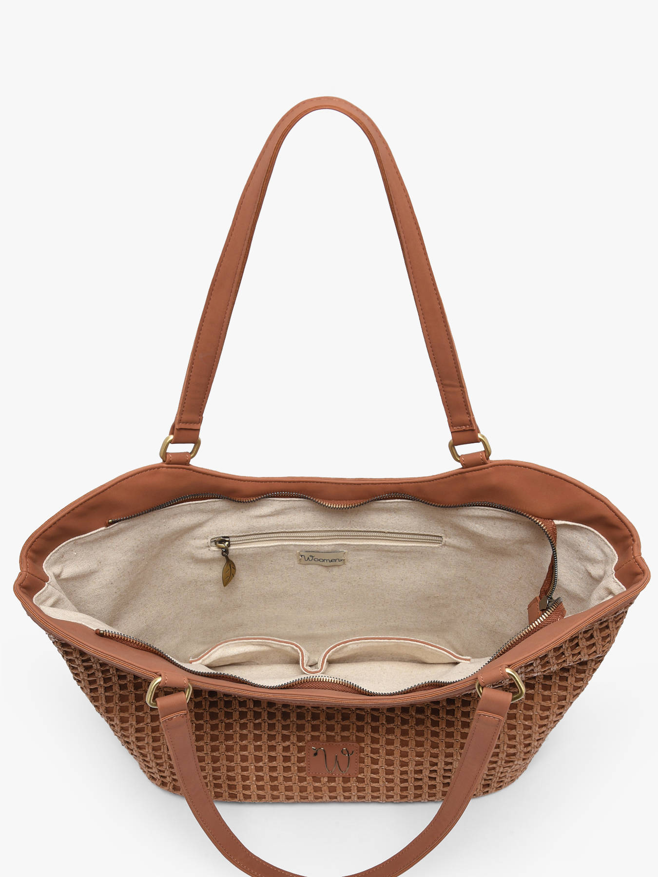 De schoudertas WOOMEN uit de lijn Neflier Estival combineert elegantie, praktisch gebruik en zomerse stijl. Het hoofdmateriaal van polypropyleen met gerecycled polyurethaan, samen met de voering van katoen en linnen, biedt lichtheid en stevigheid. De verfijnde afwerking en het pareldetail op de ritssluiting geven het model originaliteit en raffinement. Deze bimateriële tas beschikt over een ritssluiting en het gouden resinelogo, waardoor hij een elegant en functioneel accessoire is, ideaal om al je zomerse outfits compleet te maken.